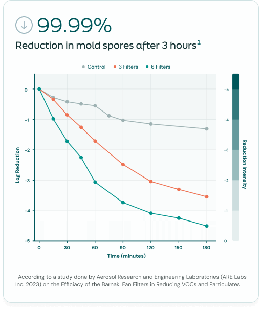A study by the Aerosol and Engineering Laboratories found using six Barnakl air filters reduced 99.9% of airborne mold in just 3 hours.